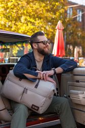 Removable shoulder strap with debossed Vegan Leather patch that doubles as a sunglass holder